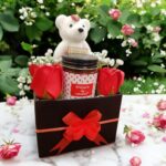 A beautifully curated Valentine’s gift box featuring a teddy bear, scented candle, artificial roses, and a stylish black gift basket with a red bow—perfect for expressing love.